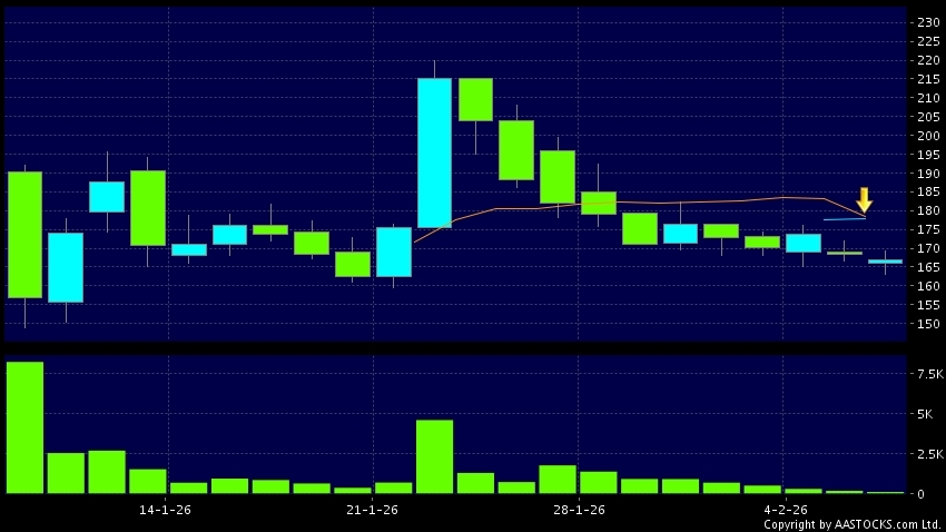 ILUVATAR COREX(09903.HK)  -2.800 (-1.664%)   's SMA 10 crosses below SMA 20, which is a death cross. Last printed at 167.000; fell 0.772%; on volume of 106.70K shares and turnover of $17.80M