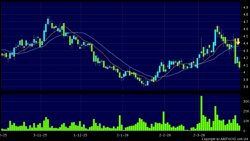 新天绿色能源(00956.HK) -0.160 (-3.800%) 沽空 $1.61百万; 比率 7.302% 10天移动平均线跌穿20天移动平均线,出现死亡交叉。现价报4.070,下跌3.325%,成交量5.43百万股,成交额2.21千万。