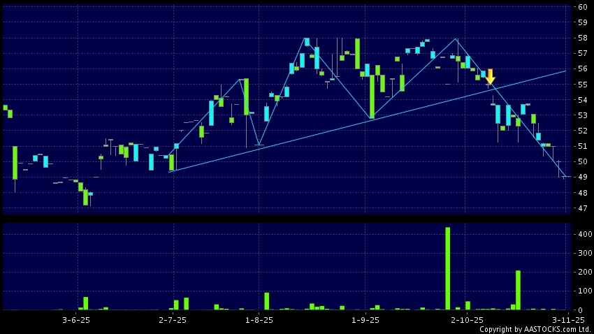 头肩顶是典型的沽出讯号,当股价跌穿支持线(颈线)时,跌势确认股价将持续下跌,技术走势偏软。(港股报价延迟最少十五分钟。)