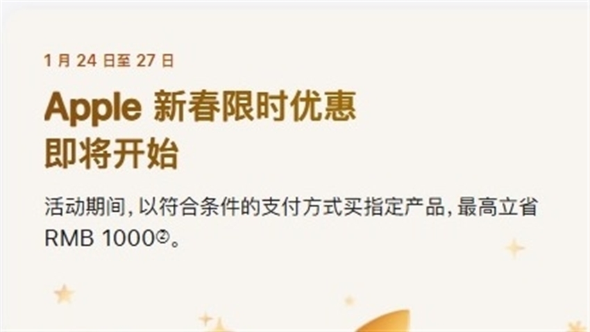 蘋果中國官網線上推出新春限時優惠活動,用戶凡於2026年1月24日至1月27日,以符合條件的支付方式購買iPhone、Mac、iPad和Apple Watch等指定產品最高立減1,000元人民幣。不過...