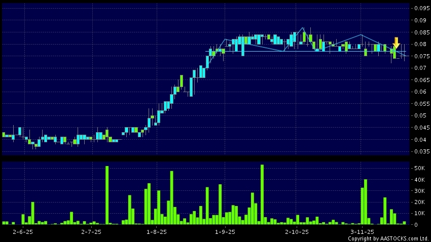 中國農產品交易(00149.HK) 0.000 (0.000%) 呈現頭肩頂向下突破。現價報0.073,下跌2.667%,成交量2.19萬股,成交額1.58千。