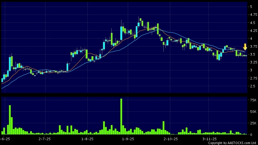 華寶國際(00336.HK) +0.080 (+1.975%) 沽空 $4.63百萬; 比率 19.722% 10天移動平均線跌穿20天移動平均線,出現死亡交叉。現價報3.490,上升1.159%,成交量1.18百萬股,成交額4.08百萬。