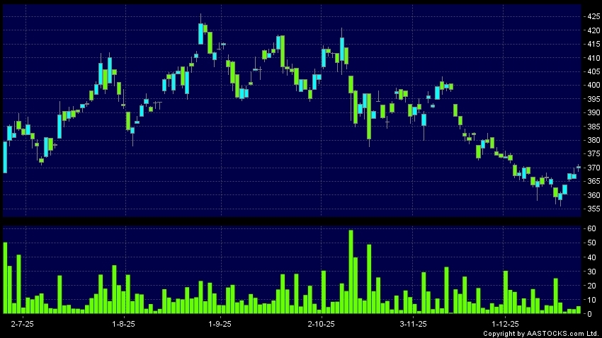 香港交易所-R(80388.HK) +2.800 (+0.761%) 沽空 $1.15百萬; 比率 43.573% 呈現三重底突破向上。現價報370.200,上升0.707%,成交量5.70千股,成交額2.11百萬。