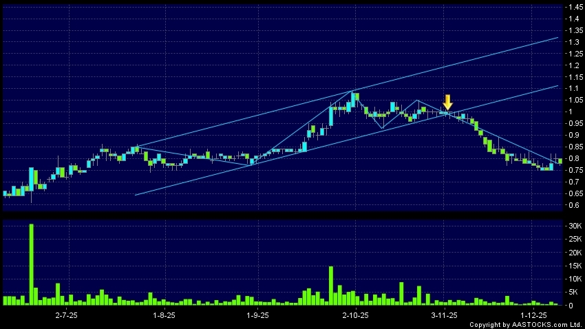 呷哺呷哺(00520.HK) +0.010 (+1.250%) 呈現區域下軌突破。現價報0.780,下跌2.500%,成交量20.15萬股,成交額15.79萬。