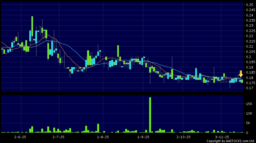 翠華控股(01314.HK) -0.005 (-2.793%) 10天移動平均線跌穿20天移動平均線,出現死亡交叉。現價報0.175,下跌1.685%,成交量32.40萬股,成交額5.78萬。