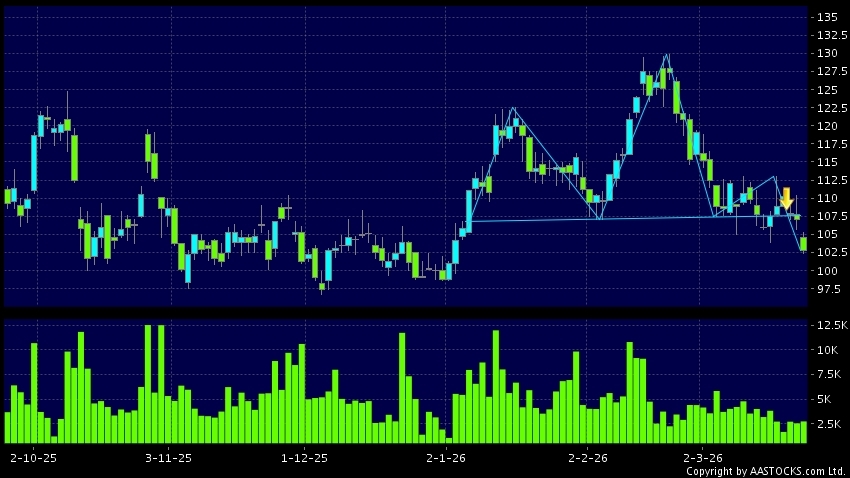 藥明康德(02359.HK) -4.900 (-4.579%) 沽空 $4.87千萬; 比率 21.149% 呈現頭肩頂向下突破。現價報102.400,下跌4.299%,成交量2.96百萬股,成交額3.06億。