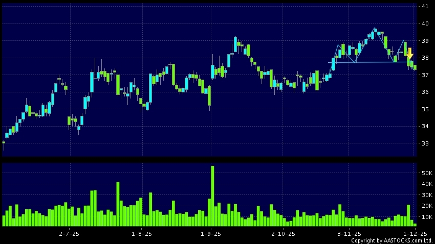 中銀香港(02388.HK)呈現頭肩頂向下突破。現價報37.300,下跌0.427%,成交量3.89百萬股,成交額1.45億。最近表現:3日 -2.151%5日 -2.611%10日 -5.378%最...