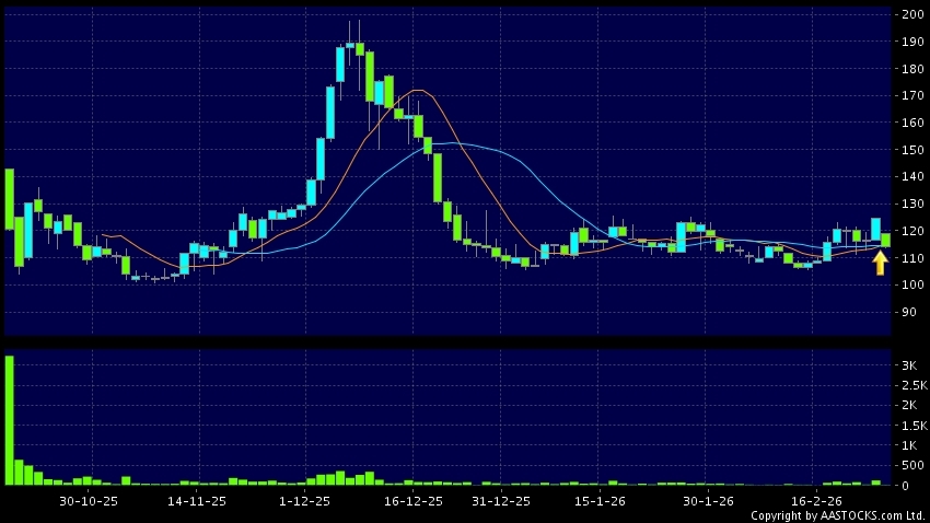 雲迹(02670.HK) +2.700 (+1.598%) 沽空 $12.74萬; 比率 1.582% 10天移動平均線升穿20天移動平均線,出現黃金交叉。現價報114.500,下跌8.180%,成交量1.77萬股,成交額2.04百萬。
