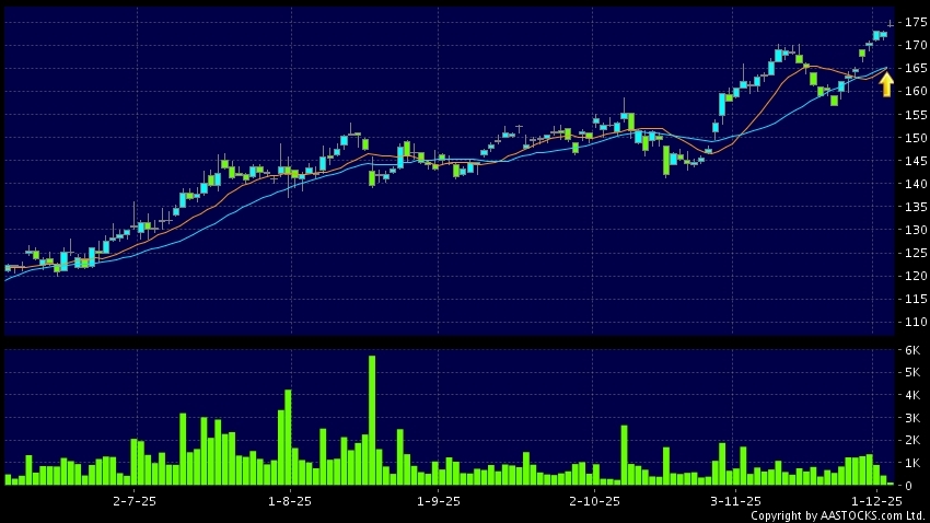 黃金交叉是一個利好訊號,指股價的短期移動平均線升穿長期移動平均線,例如50天線升穿250天線,在圖表上構成交叉的形狀。股價通常會上升形成一個上升趨勢,技術走勢向好。(港股報價延遲最少十五分鐘。沽空資料截至 2025-12-03 16:25。)