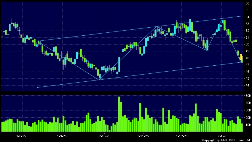 區域突破指股價在過去的一段時間只在一個範圍在內活動,然後股價下跌作出突破,跌穿區域的底部,技術走勢偏軟。(港股報價延遲最少十五分鐘。沽空資料截至 2026-01-19 16:25。)