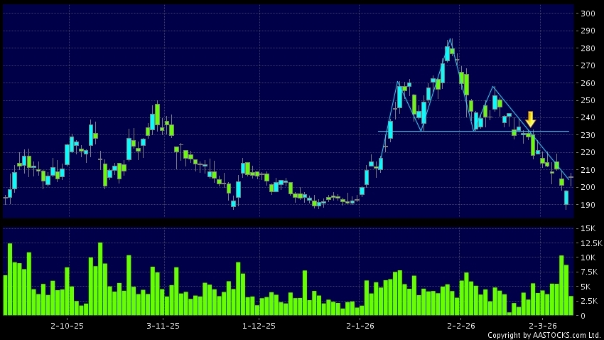 頭肩頂是典型的沽出訊號,當股價跌穿支持線(頸線)時,跌勢確認股價將持續下跌,技術走勢偏軟。(港股報價延遲最少十五分鐘。沽空資料截至 2026-03-10 16:25。)