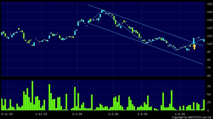 區域突破指股價在過去的一段時間只在一個範圍在內活動,然後股價上升作出突破,升穿區域的頂部,技術走勢向好。(港股報價延遲最少十五分鐘。沽空資料截至 2026-04-24 16:25。)