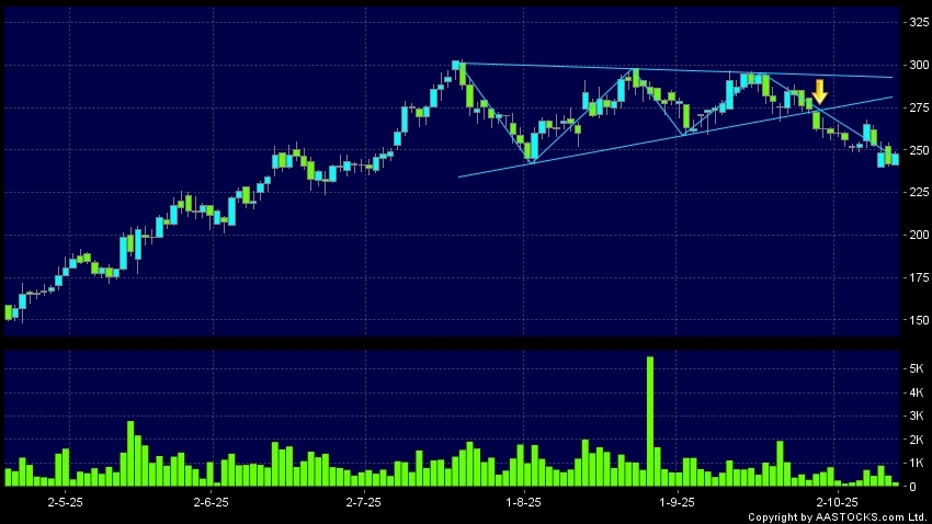 三角形向下突破是指股價的波幅漸漸收窄,在圖表上形成三角形般的狀態。股價在三角形的末端向下突破,下跌趨勢形成,技術走勢偏軟。(港股報價延遲最少十五分鐘。沽空資料截至 2025-10-15 16:25。)